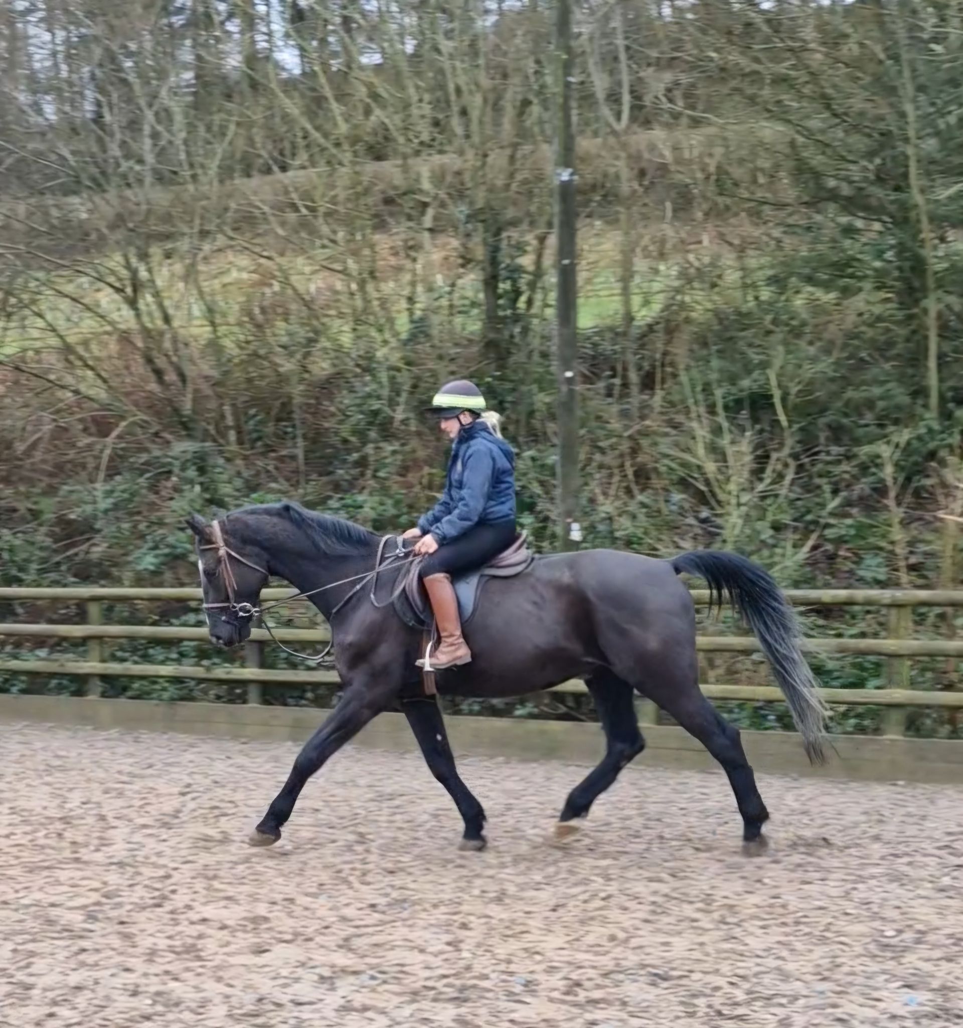Letty has recently been broken by ourselves and is coming along very nicely, jumping small jumps happily, hacking out in company and on her own, when in company she is happy to go front or back. A lovely mare to ride.