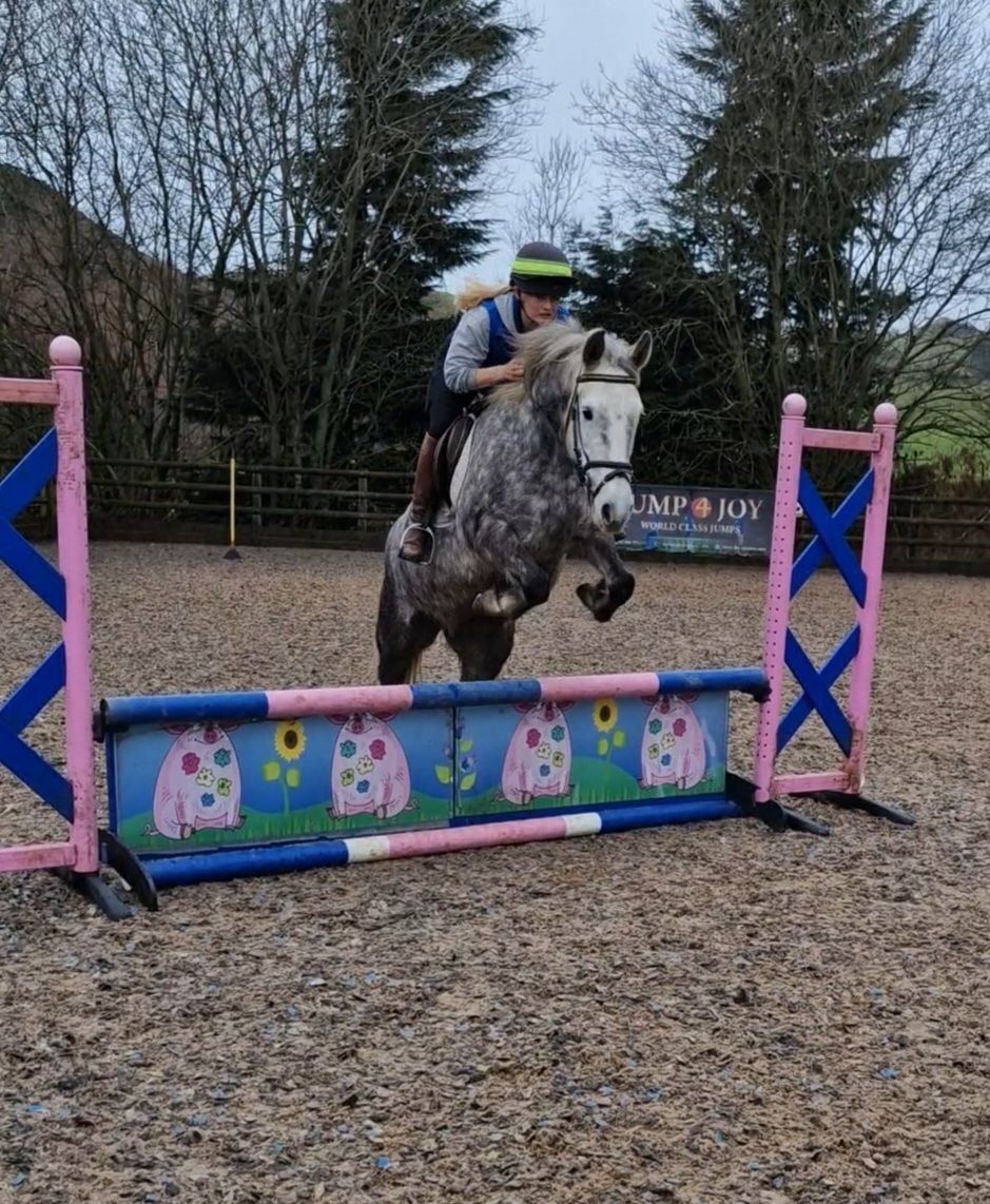 She is enjoying her jumping over coloured poles and is showing potential to be a great teenagers/small adult show jump pony, and has good enough paces to do working hunter classes.